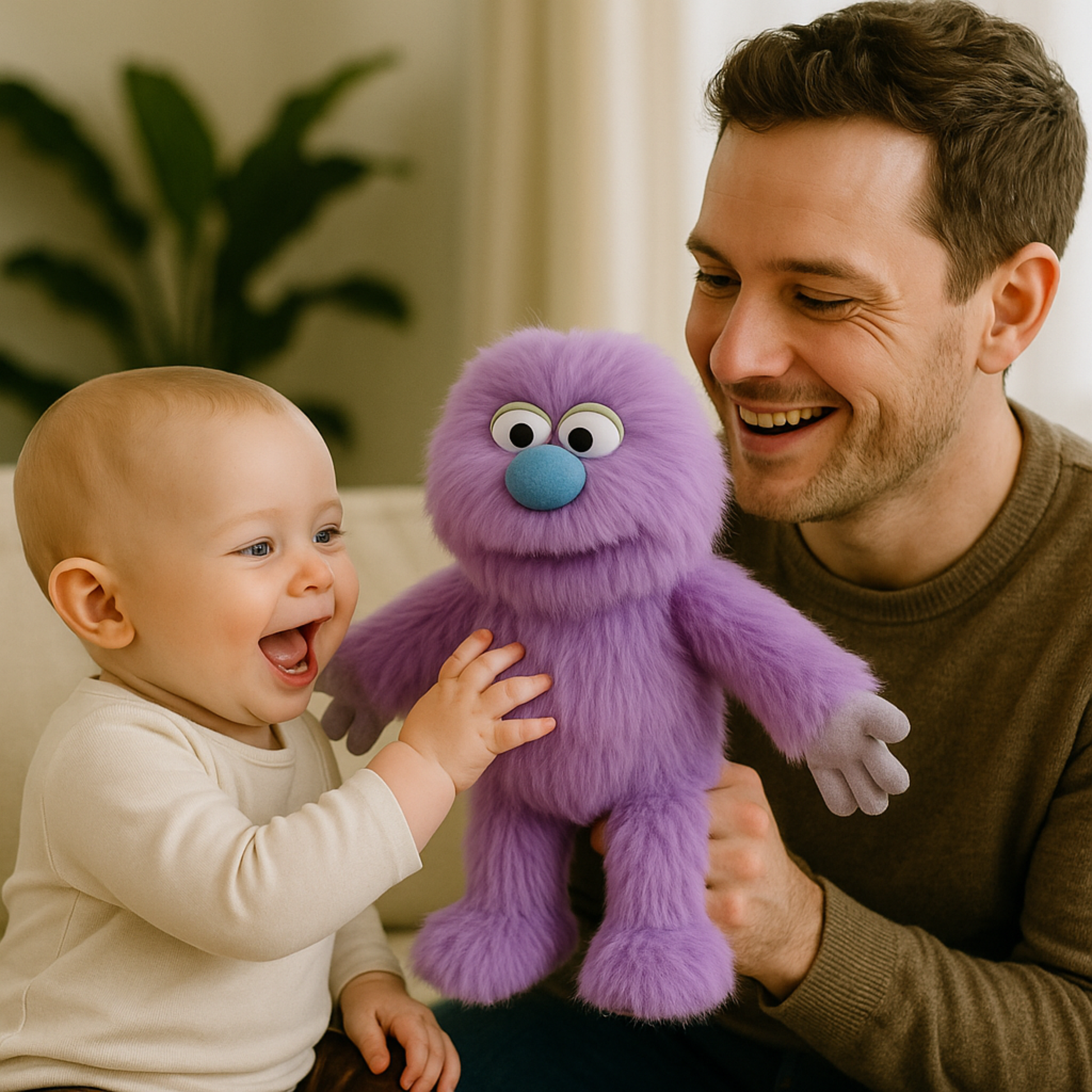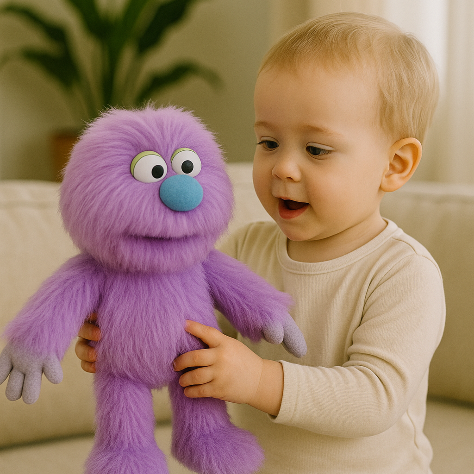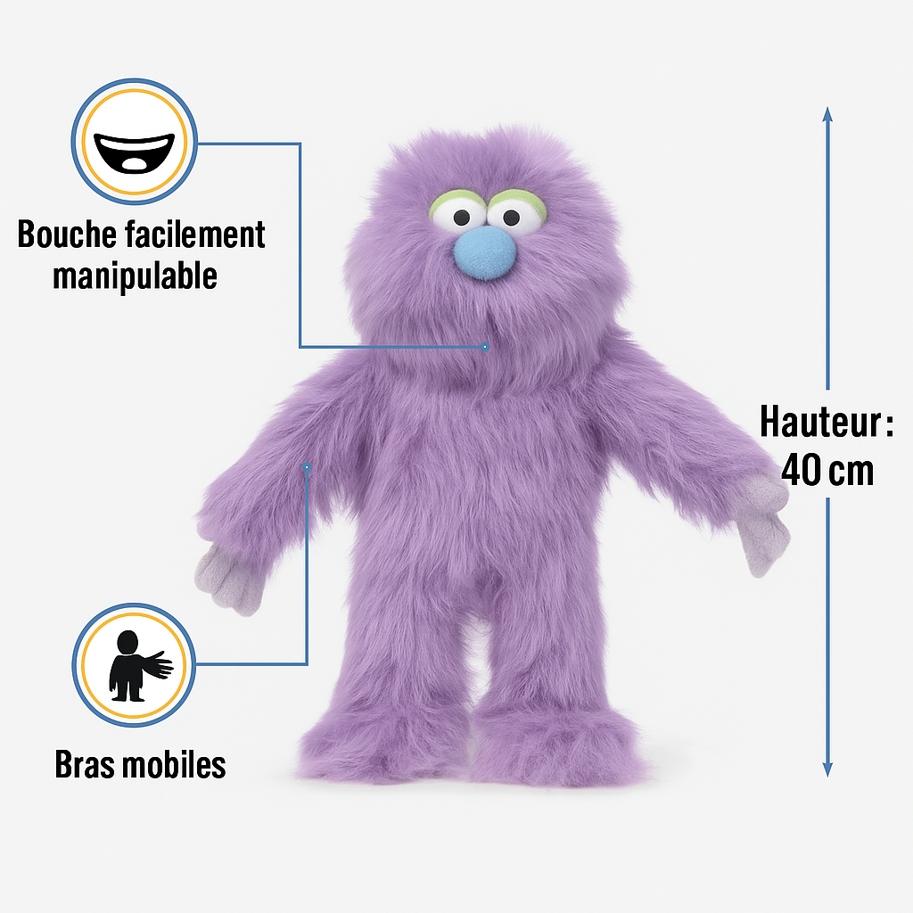 Sa fourrure violette toute douce, son gros nez bleu rigolo et ses yeux curieux captivent instantanément. Grâce à sa bouche souple et ses bras mobiles, Violette prend vie au bout des doigts pour raconter des histoires, inventer des personnages ou animer des moments de jeu.