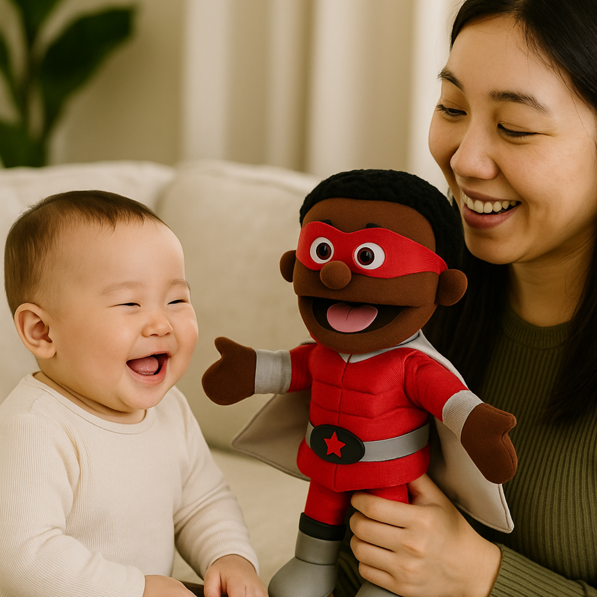 Cette marionnette super-héros de 40 cm impressionne par son style unique et ses finitions travaillées. Son corps musclé, sa cape éclatante et son masque brodé en font un véritable personnage plein de charme. Les vêtements sont cousus directement sur la marionnette pour garantir durabilité et sécurité.