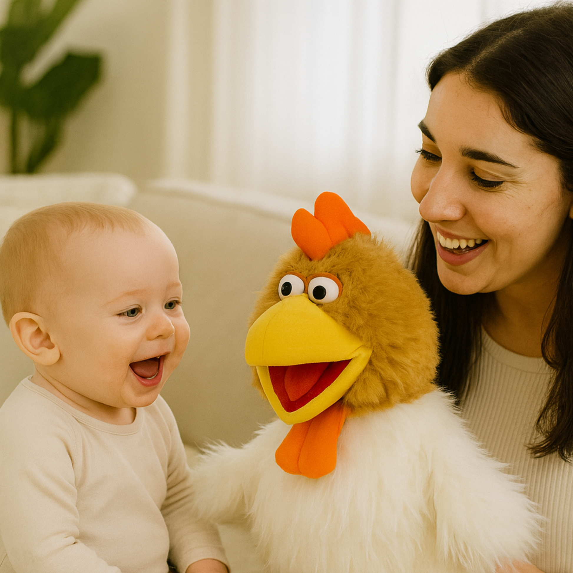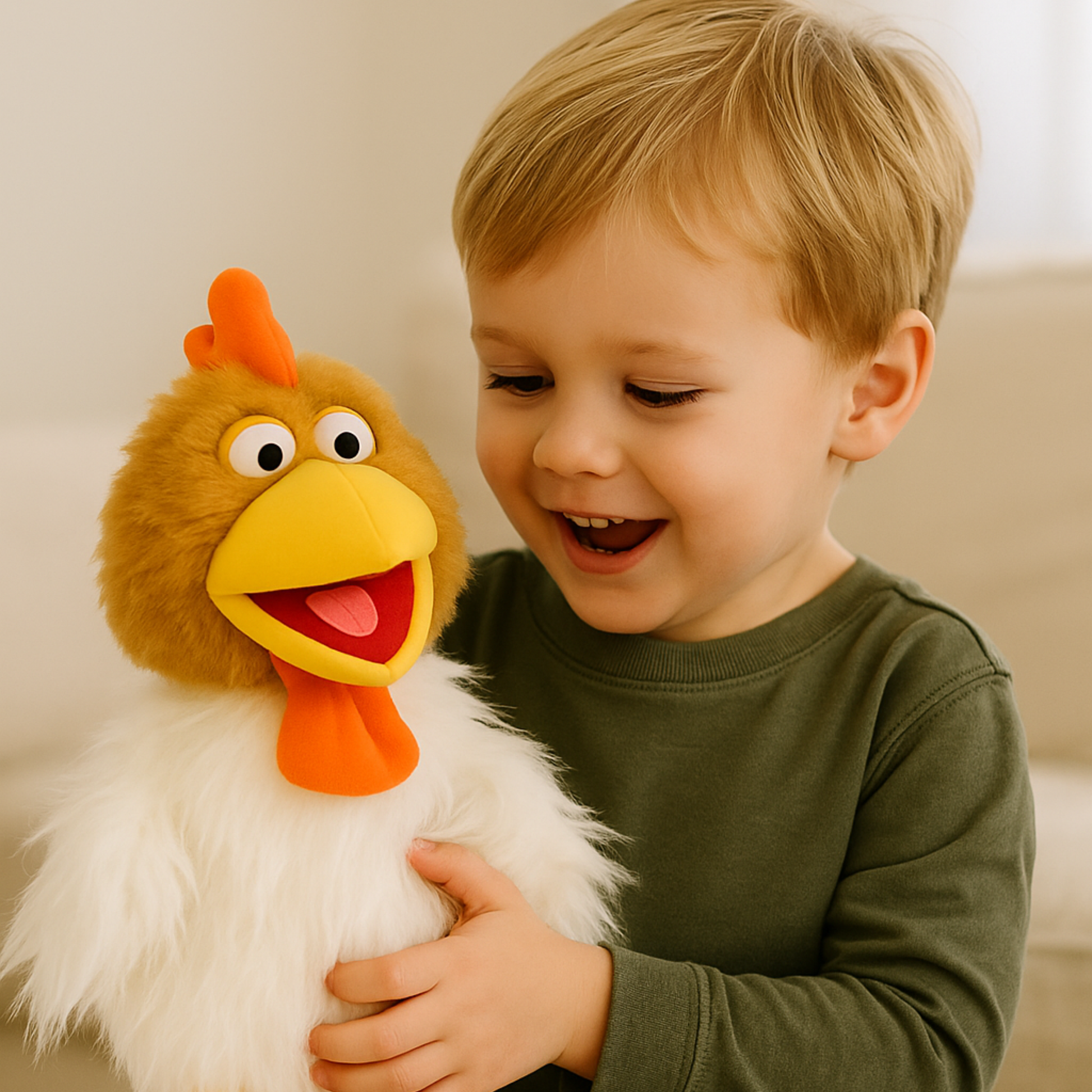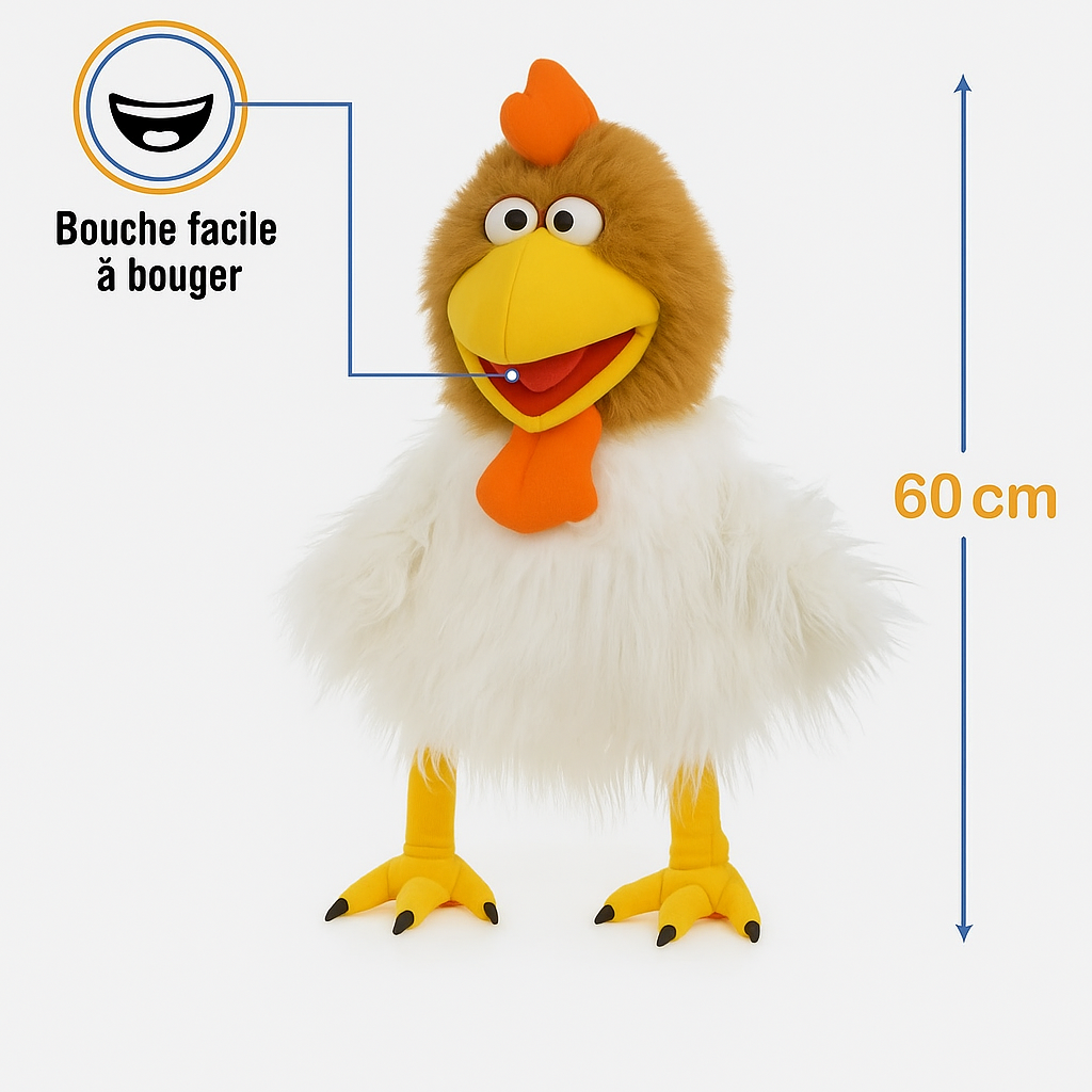 Cette grande marionnette poule de 60 cm ne passe pas inaperçue ! Avec son plumage duveteux, son bec expressif et sa grande taille, elle captive instantanément l’attention des enfants. Parfaite pour inventer des histoires farfelues à la ferme, elle stimule l’imagination, développe le langage et amuse toute la famille.