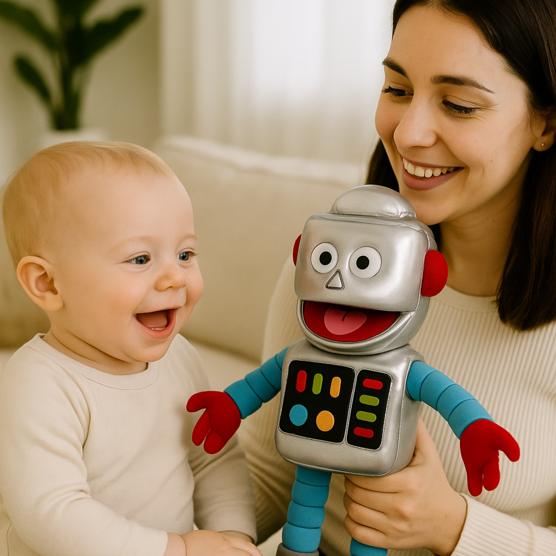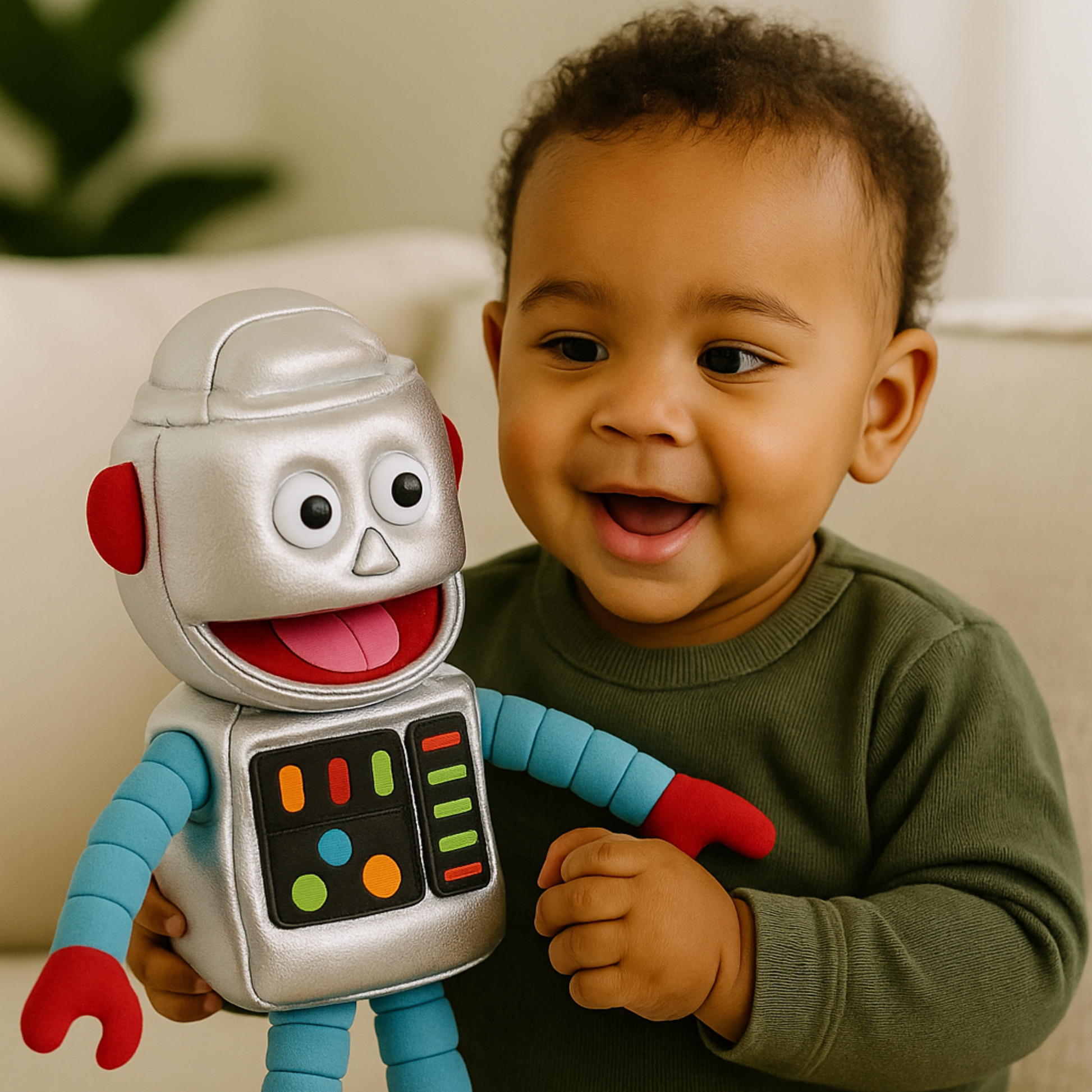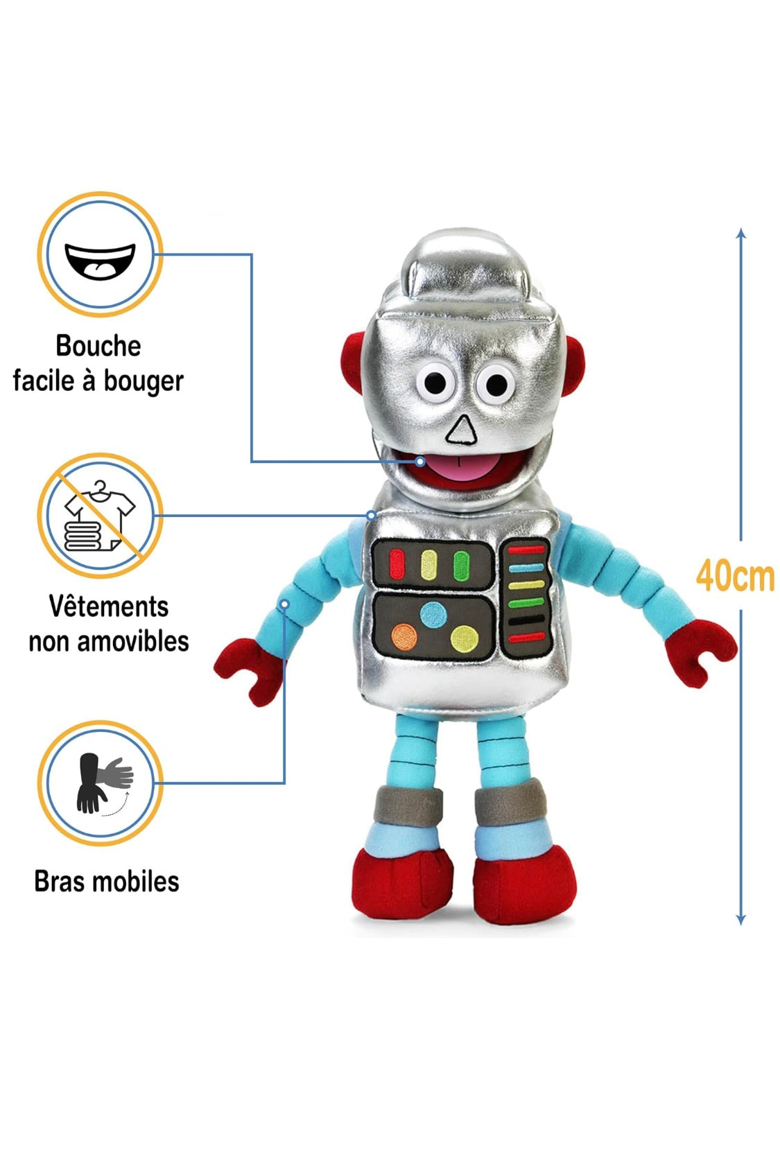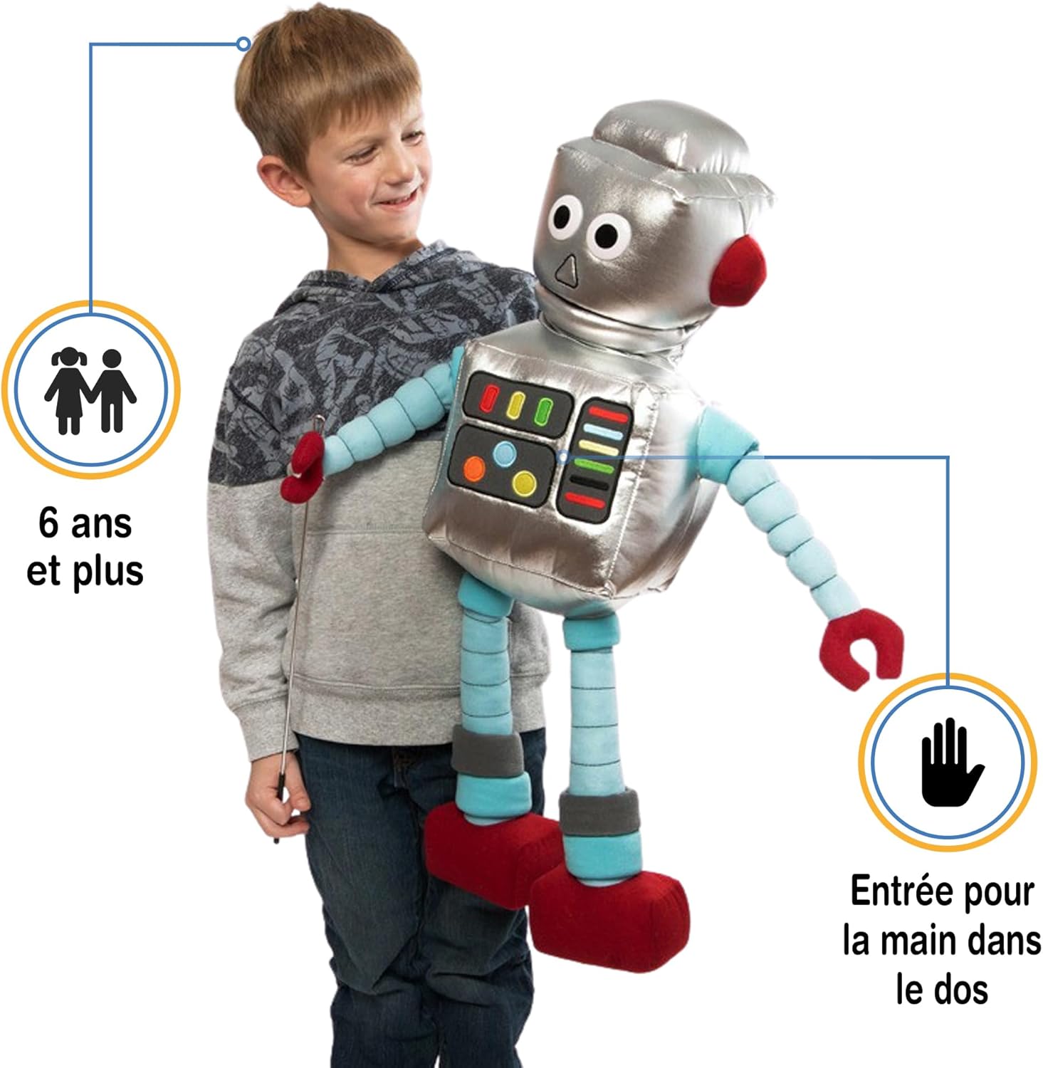 Cette marionnette robot de 40 cm allie imagination et futurisme pour captiver petits et grands. Avec son design métallique coloré, ses yeux expressifs et ses détails inspirés des robots rétro, elle devient un compagnon de jeu unique pour inventer des aventures intergalactiques.